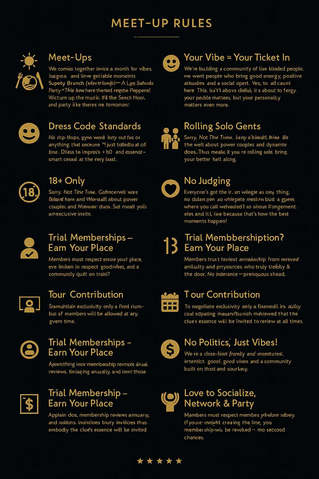 We’re a close-knit family and we believe in respect, good vibes, and a community built on trust and courtesy. We expect our Club members to treat each other with kindness and respect at all times. That said, we have zero tolerance for anything shady—no unethical, illegal, or inappropriate activities. If you’re caught crossing the line, your membership will be revoked immediately—no second chances.
